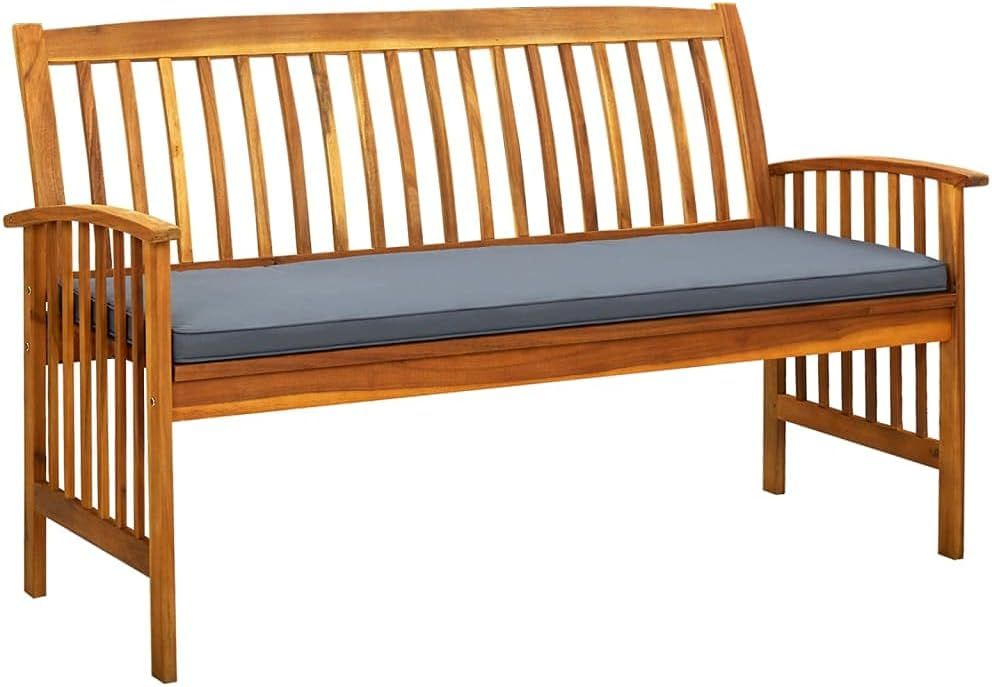 Cushion colour: Dark greyBench material: Solid acacia wood with an oil finishCushion material: Fabric (100% polyester)Bench dimensions: 147 x 64 x 90 cm (W x D x H)Cushion size: 138 x 54.5 cm (L x W)Seat width: 138 cmSeat depth: 54.5 cmSeat height from the ground: 44 cmFeaturing slatted designAssembly required: Yes1 x Bench1 x Cushion